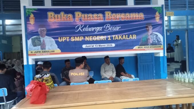 Takalar, Lintasnusantara.Online- Suasana kebersamaan dan kekeluargaan terasa hangat dalam kegiatan buka puasa bersama yang digelar di UPT SMP Negeri 1 Takalar, Jumat (13/03/2026). Kegiatan tersebut bertujuan untuk mempererat hubungan silaturahmi antara guru, kepala sekolah, dan unsur komite sekolah di bulan suci Ramadan.